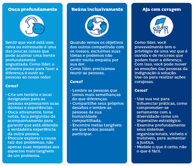 Pesquisas mostram que, embora uma maioria saudável de trabalhadores expresse o desejo de ser aliados, poucos sabem como fazê-lo. O modelo de aliado da NLI® apresenta uma estrutura para ajudar os líderes a começar a jornada de aliado. Envolve três etapas cruciais: Ouça profundamente, Reúna inclusivamente e Aja com coragem. Cada um é igualmente essencial para apoiar sua equipe e impulsionar a mudança de que precisamos.