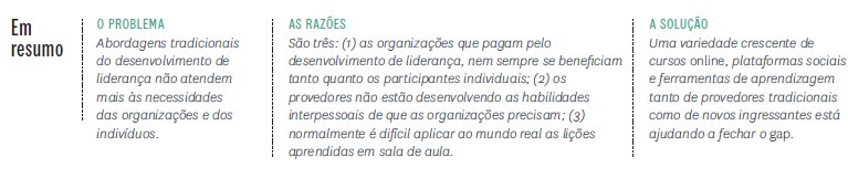 A segunda é o gap entre as habilidades que os programas de desenvolvimento executivo fornecem e o que as empresas exigem — principalmente habilidades interpessoais essenciais para prosperar em organizações planas, conectadas em redes e cada vez mais colaborativas. Os provedores tradicionais têm expertise para ensinar habilidades cognitivas e medir seu desenvolvimento, mas têm muito menos experiência em ensinar as pessoas a se comunicar e a trabalhar colaborativamente de forma eficiente.