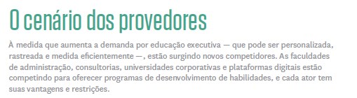 Entre os atores mais novos estão empresas de assessoria em recursos humanos, grandes consultorias em gestão, e startups digitais. Esse é um cenário de fornecedores de serviços que muda com rapidez, mas é um mundo que precisamos conhecer intimamente como educadores, consultores e líderes de programas de educação executiva da Rotman (no caso de Mihnea) e da Harvard Business School (no caso de Das). E para ajudar a compreender melhor a situação, elaboramos uma tabela que compara os atores (ver quadro “O cenário dos provedores”).