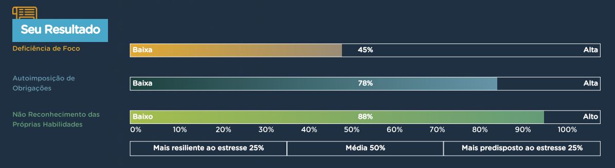 No gráfico temos que: em uma, duas ou nas três formas de pensamento avaliadas, abaixo de 25% podemos ser resilientes ao estresse. Quando estamos na faixa dos 25% aos 75%, sabemos lidar com o estresse de forma equilibrada. Agora, quando vamos chegando aos 75% avançando para os 100%, estamos mais predispostos ao estresse e inspiramos mais atenção e cuidados.