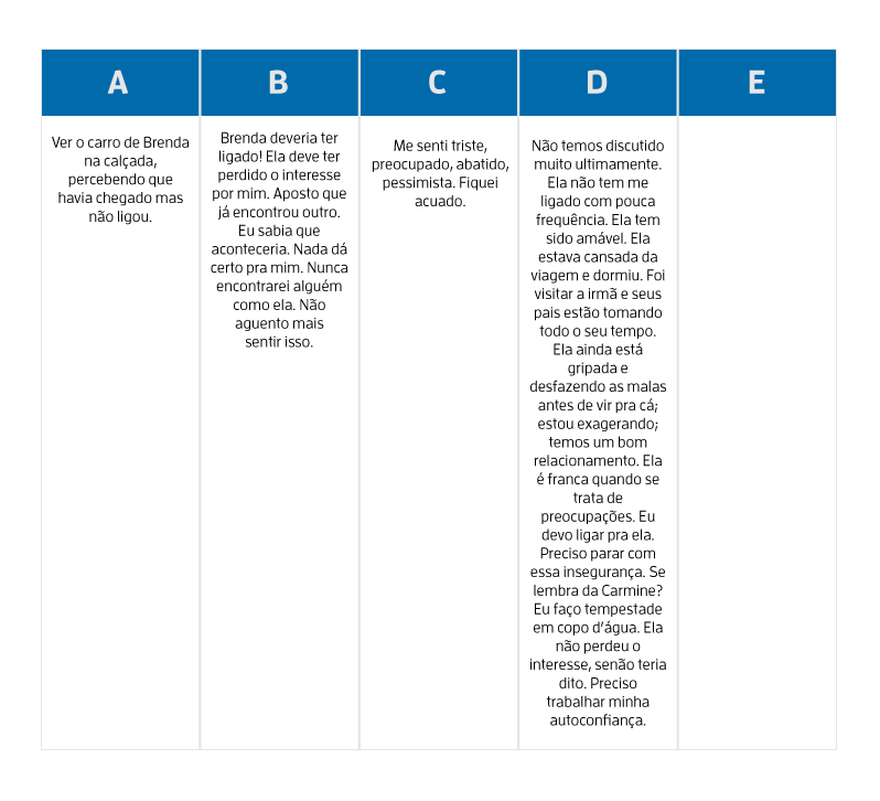 O preenchimento da tabela ajudou Bobby a dominar a arte dos ABCDEs em vez de sucumbir à melancolia, de acordo com seu novo e melhorado monólogo: “Nossa, estou para baixo mesmo. Também, não é pra menos! Olha o que eu andei dizendo a mim mesmo. Isso não é jeito de se comportar. Quem disse que Brenda tem que fazer alguma coisa senão ligar para mim assim que chegar? Tudo bem, ela não ligou. Há várias explicações lógicas. O que não é lógico é esse meu comportamento, pensando que ela me largou por causa de um cara qualquer. Isso não faz sentido – não há evidências disso mesmo. Ela sempre foi aberta e franca comigo. E como eu a agradeço por agir assim? Saio pela tangente e me tranco no quarto. Vou fazer algo para mudar isso. Na verdade, vou ligar para ela e dar as boas-vindas”.