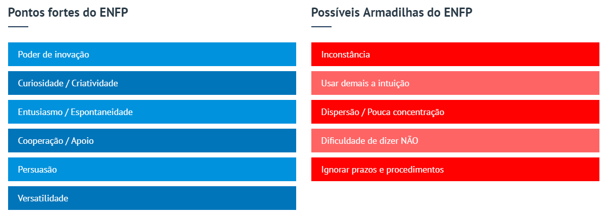 Como o ENFP é muito sensível e atento(a), pode sofrer tensões musculares. Está sempre pronto(a) para as emergências. Devido a essa facilidade, entende que isso também ocorre com os outros. Pode se tornar rapidamente aborrecido(a) com pessoas e situações e resiste muito em repetir experiências. Adora o processo de criar alguma coisa – a ideia de um projeto – mas não se mostra tão interessado(a) em dar continuidade a ele. Entusiasma-se e isso é “contagioso”. As pessoas se sentem cativadas pelo(a) ENFP. No entanto, é marcado(a) por uma tenaz independência, repudiando qualquer tipo de subordinação. Seu carisma atrai seguidores que desejam que lhes seja mostrado o caminho. É normalmente cercado(a) por pessoas que procuram em você a sabedoria, a inspiração, a coragem e a liderança: uma expectativa que algumas vezes recai pesadamente sobre você. Por ser otimista, o ENFP fica surpreso(a) quando pessoas ou eventos não são aquilo que imaginava. Muitas vezes, a sua confiança e a bondade da natureza humana são profecias autocriadas.