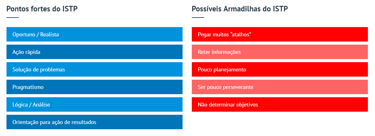 Sua liderança é de expediente e exploratória, baseada num tipo especial de inteligência que pode ser chamada de concretismo artístico, mas tende a achar que não precisa preparar-se para nada. Assim, o ISTP tem um tipo especial de inteligência, caracterizado pela praticidade e espontaneidade. Uma das coisas mais importantes para você é sua comunhão com pessoas que tenham o mesmo estilo que o seu. Está sempre à disposição, é alegre, leal e não gosta de viver confinado(a). É descomplicado(a) em seus desejos, confiável.